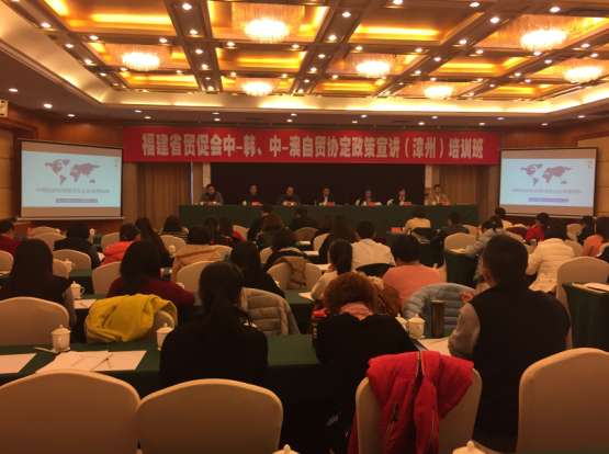 1月12日,中-韩、中-澳自贸协定政策宣讲培训班在漳州宾馆开班。培训班邀请了海关总署福州原产地证办公室、福建省贸促会法律部等部门专家,针对中韩、中澳自贸协定享惠政策进行解读,共有120多家进出口企业参加。这是福建省贸促会为配合中韩、中澳自贸协定实施,助推企业用好优惠政策,在全省各市、地区开展宣讲培训活动之一。