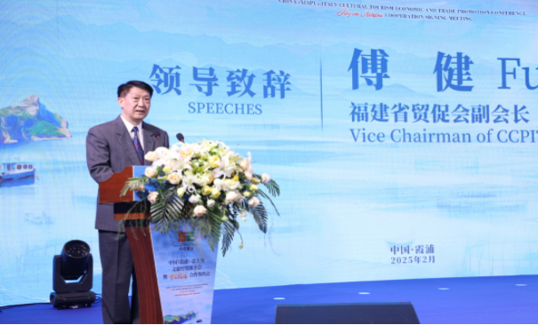 傅健在致辞中表示,今年是中意建交55周年,举办此次推介会和合作签约会,以中意两国领导人重要共识为引领,发扬两国友好交流传统,深化经济产业、体育人文等领域合作,意义重大。福建是中国最具成长性、最具竞争力的区域之一,数字经济、海洋经济、绿色经济、文旅经济蓬勃发展,电子信息、纺织鞋服、机械装备等产业规模超过万亿元。福建是中国最早对外开放的省份,全省缔结126对国际友好城市,国际朋友圈不断拓展,高水平开放不断扩大。意大利是中国在欧盟的第四大贸易伙伴,也是福建在欧洲的重要合作伙伴,双方资源禀赋互补、贸易投资互利、产业发展契合,希望以此次霞浦与卡利亚里市建立友城意向为契机,进一步推动福建与意大利在科技、教育、能源交通、电子商务、文化体育等领域全方位、深层次交流合作。未来,省贸促会将进一步推动福建省与撒丁大区在更高层级的互访交流,深化福建省与撒丁大区友好合作。省贸促会也将充分发挥大阪世博会、中国国际供应链博览会、“9·8”投洽会等重要会展经贸平台优势,推广深化宁德霞浦和撒丁大区及卡利亚里市的经贸文化合作成果。