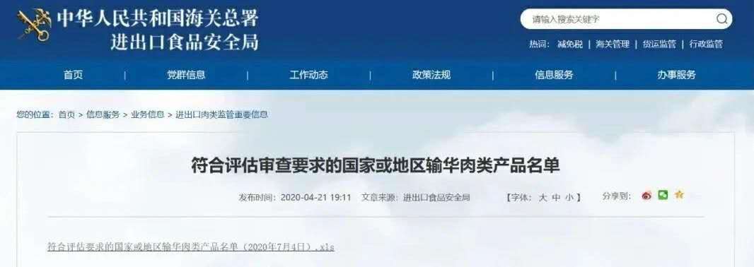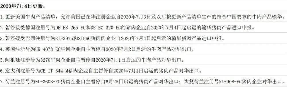 据悉,这6家猪肉企业和2家牛肉企业来自德国、巴西、英国、阿根廷、意大利、荷兰6个国家。同时,荷兰一家注册号NL-908-EG猪肉企业恢复对华出口。