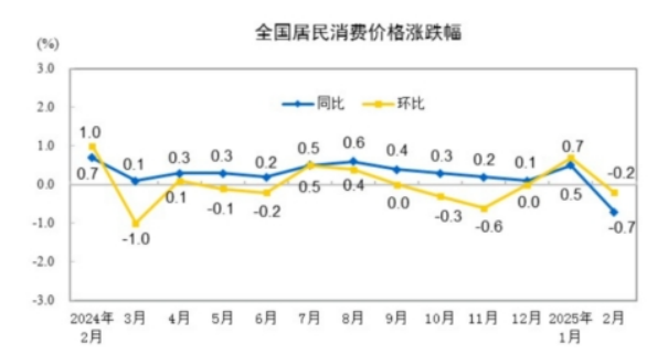 3月9日,国家统计局最新发布的月度数据显示,受春节错月、假期和部分国际大宗商品价格波动等因素影响,2月份,居民消费价格指数(CPI)环比下降0.2%,同比下降0.7%;工业生产者出厂价格指数(PPI)环比下降0.1%,同比下降2.2%。从结构看,一些领域价格显现积极变化,CPI中部分工业消费品和服务价格稳中有涨,PPI降幅有所收窄,当前物价温和回升的态势没有改变。