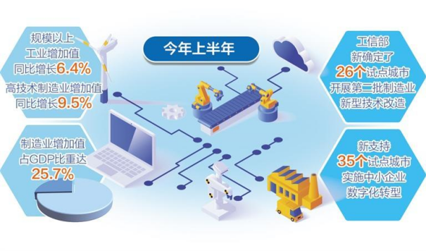 上半年,数字化转型加速推进。工信部新确定了26个试点城市开展第二批制造业新型技术改造,新支持35个试点城市实施中小企业数字化转型。在电子信息、电力装备、轻工、石化化工、钢铁、有色金属、建材等行业,加快推进数字化转型行动。