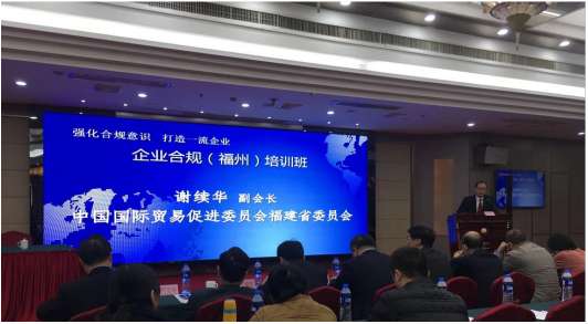 为满足我省企业“请进来,走出去”需要,帮助企业全面加强合规管理,更好地服务我省经济高质量发展和对外开放大局,2019年12月26日,由中国贸促会商事法律服务中心和福建省贸促会联合主办、福建省人民政府国有资产监督管理委员会协办的“企业合规(福州)培训班”在福州成功召开。中国贸促会商事法律服务中心副主任张顺、福建省贸促会副会长谢续华出席培训并致辞。来自全省各地近180名企业负责人、法务负责人及行业代表参加了本次培训。