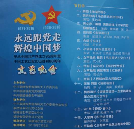 歌声嘹亮,穿越历史时空;舞姿绚烂,绽放时代风采。由省直机关工委等主办、省贸促会机关党委等协办的纪念中国共产党成立95周年暨中国工农红军长征胜利80周年“永远跟党走、辉煌中国梦”文艺晚会,于7月3日晚在福州大戏院隆重举行。省贸促会党组书记、会长张秋和党组成员、副会长傅健出席晚会,机关全体党员、处以上党外干部与省直机关各单位代表1000多人共同观看了演出。