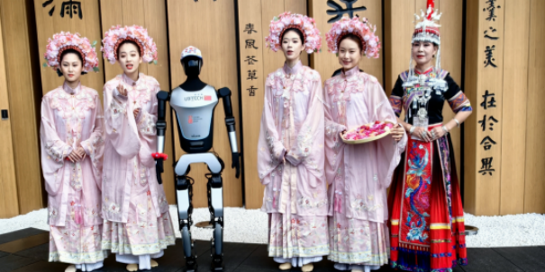 泉州簪花女、宁德畲族女和机器人组成的中国馆特色迎宾队