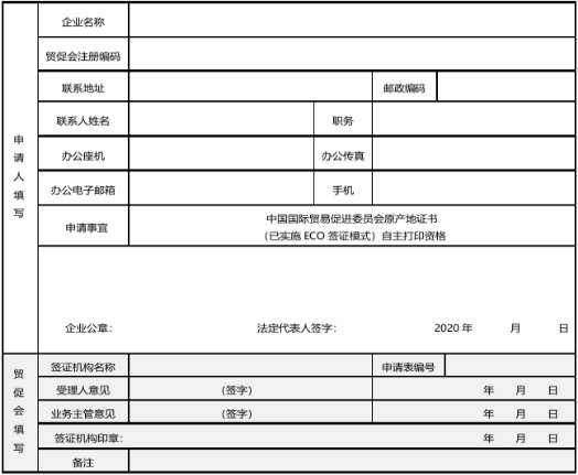 原产地证书自主打印企业申报表